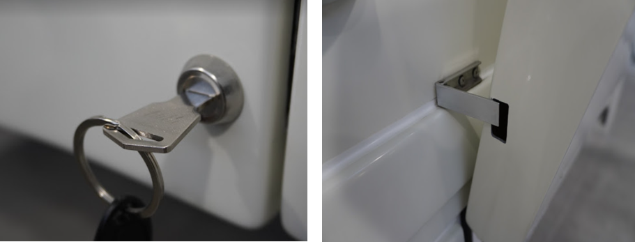 リアとサイドの2か所の扉からアクセスできます。 <ご使用方法> キーを差し込みキーシリンダーを左へ90度回転させると黒いハンドルが出てきます。黒いハンドルを左へ180度回転させます。扉を開けます。扉をストッパーで固定します。ロックする際は、鍵穴を縦の状態にしてハンドルを押し込むだけでロックができます。