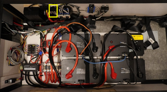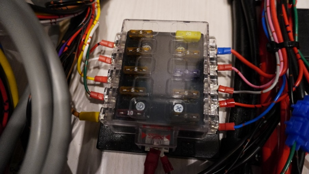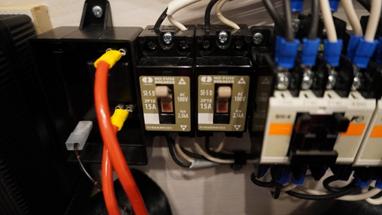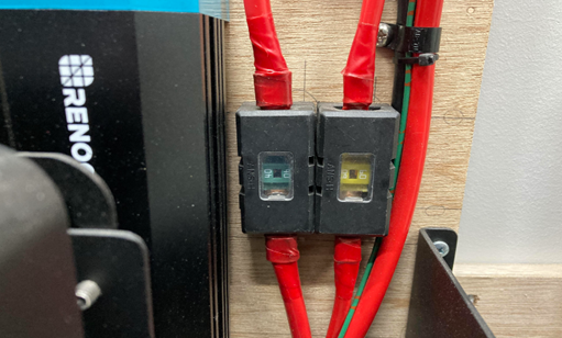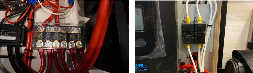 インバーター・サブバッテリー用ヒューズは、 左側: ソーラーパネル、右側:サブバッテリー