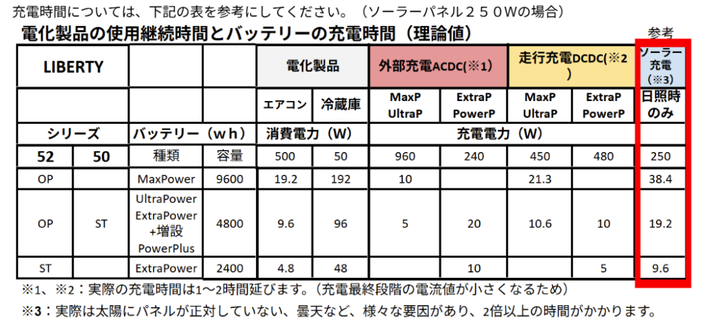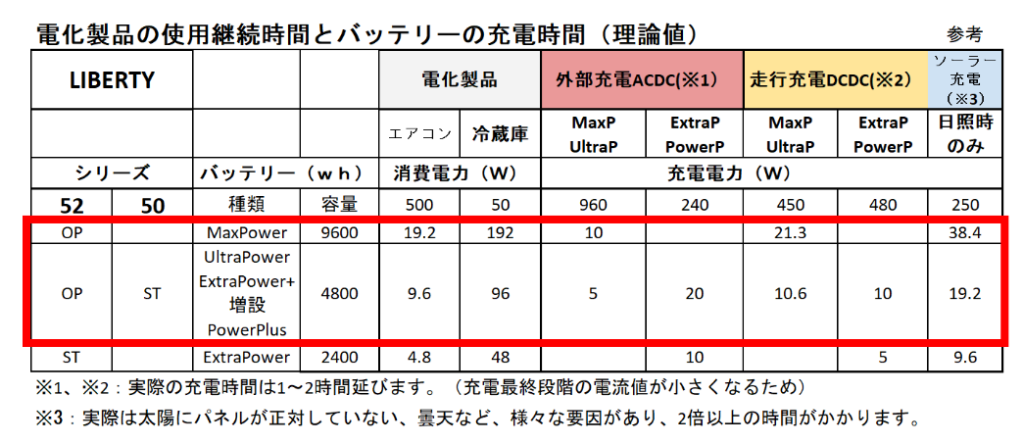 <注意事項>                                        車外、室内でお使いになる電気機器は合計で1500W以下にしてください。(レノジー)        800W以上(ホームエアコン、電子レンジ、ドライヤーなど)の電力を必要とする電気機器類をご使用の際はエンジンを停止させてご使用ください。                            外部電源接続時は車外車内でお使いになる電気機器は合計で1500W以下にしてください。(ビクトロン)                                             インバーターチャージャーと併用する場合は、2000W以下でご使用ください。