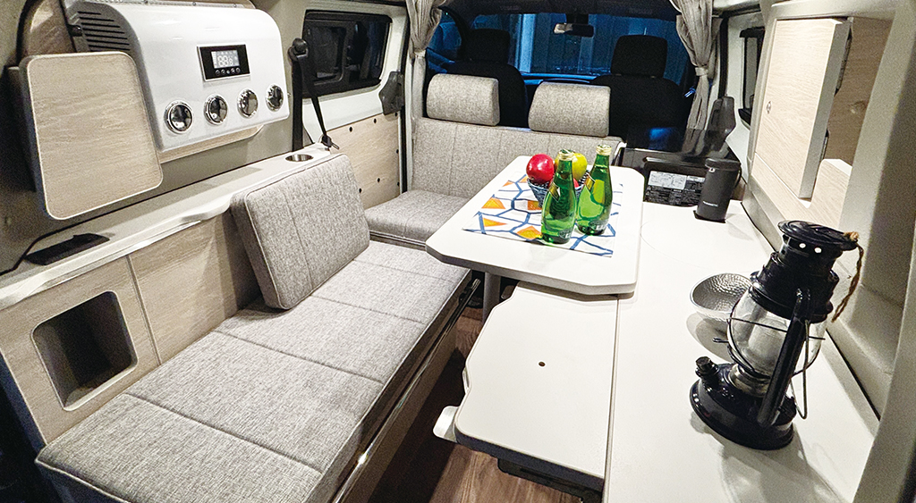 セカンドシート右に電子レンジやポータブル冷蔵庫が置ける多機能カウンターを設定。