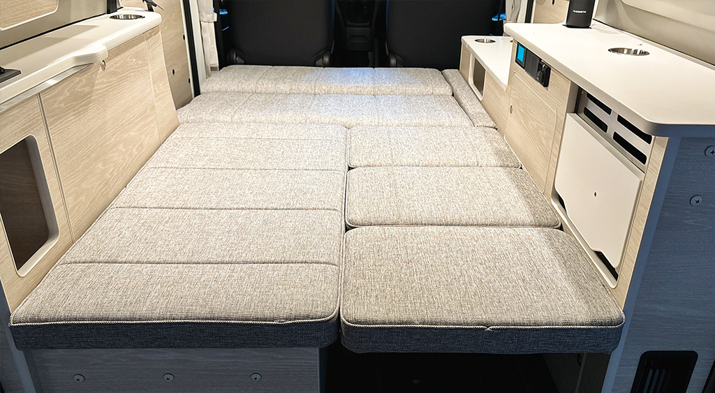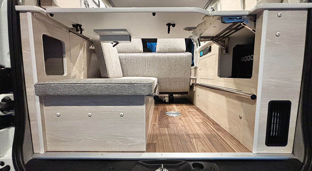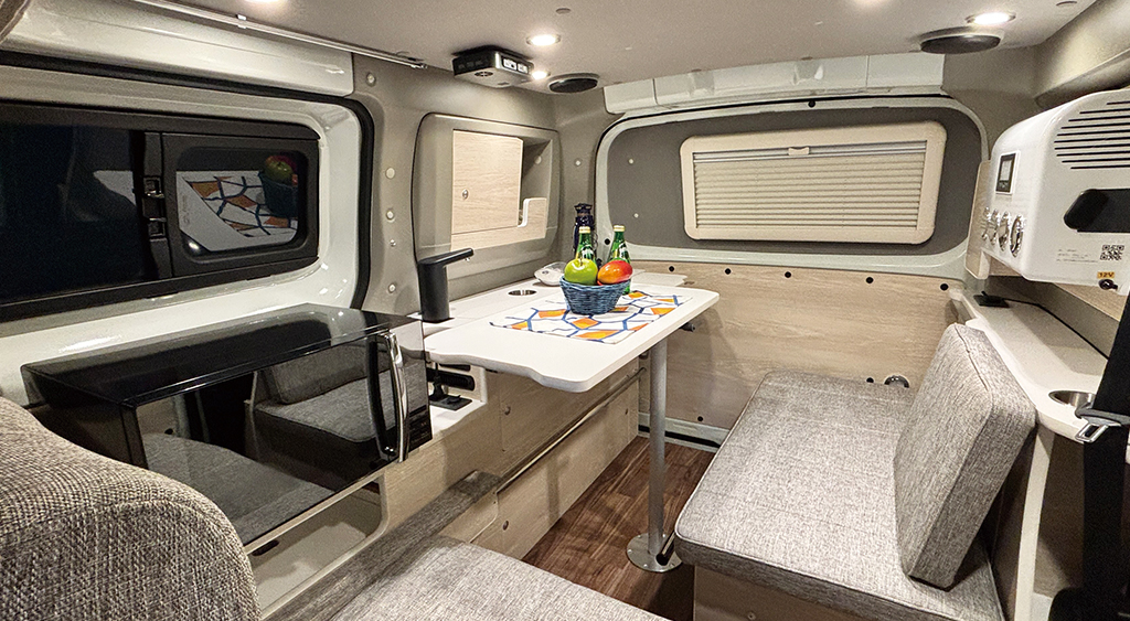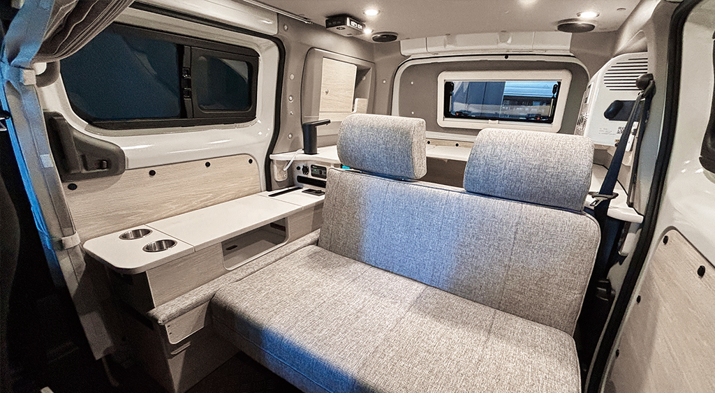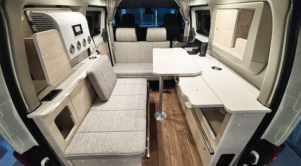 インテリアカラー(標準カラー:ライト)、FASP1000シート(3点式 & 2点式シートベルト)、横向きシート(2点式シートベルト)、ベッドマット、床面クッションフロア仕上げ、サイドカウンターロング、脱着式テーブル(大型タイプ)、スライドドア+リアハッチ(ライト付き)木目トリム、カーテン