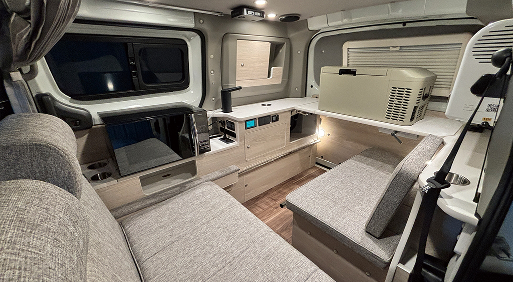 ポータブル冷蔵庫・電子レンジの設置スペースを確保!車内での調理・保存の自由度を劇的に高めたレイアウトです。