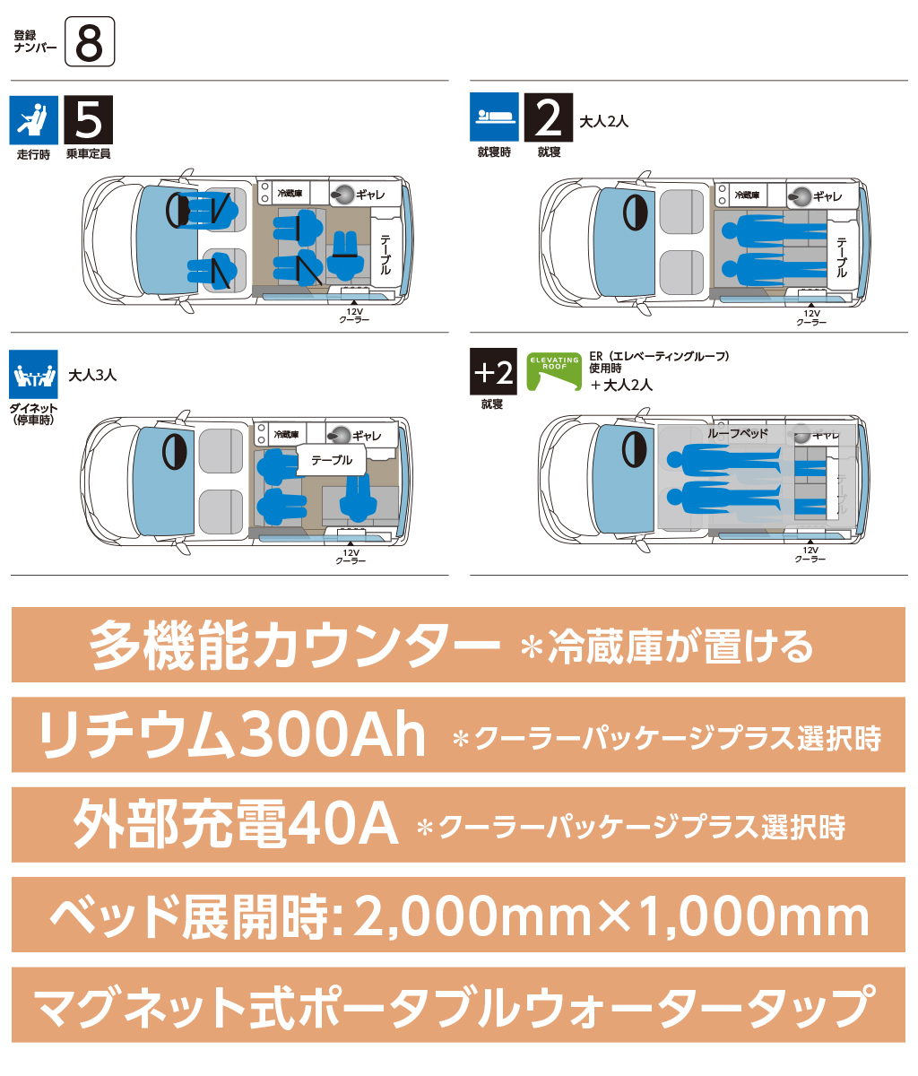 サブバッテリーシステム(標準・クーラーパッケージ:VARTA AGM 70Ah・クーラーパッケージプラス:リチウム300Ah)、バッテリーメーター、メインスイッチ (LED)、バックドア木目トリム (LED付)(2個)、12Vソケット、ダウンライト (LED)(リモコンディマー付)6個(ERは8個)、100Vコンセント、外部電源装置(10Aチャージャー:標準、40Aチャージャー:クーラーパッケージプラス選択時)