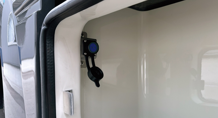 床下収納庫内(左側)に外部電源口が設けられています。車外で100V電源が使用可能。