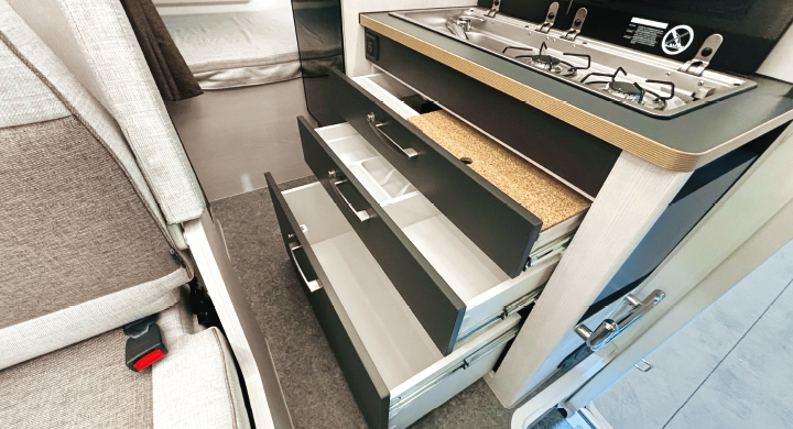 ステンレスシンクと2バーナーコンロがセットになります(耐熱ガラスカバー付)。引き出しにはキッチン用品をしっかり収納出来ます。