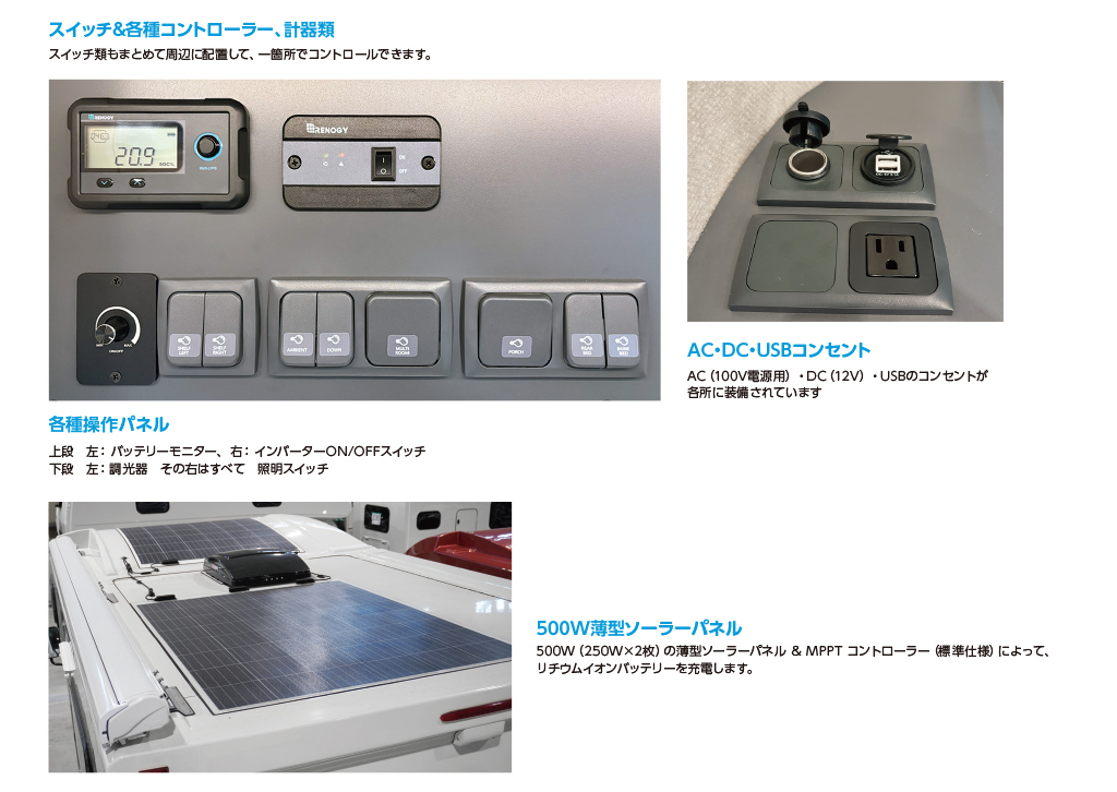 薄型で軽いソーラーパネルをルーフに設置。太陽光を効率よく取り込み、サブバッテリーを充電します。安心の電力供給を実現します。
