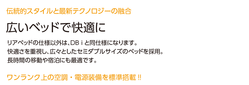 快適さを重視し、広々としたセミダブルサイズのベッドを採用。長時間の移動や宿泊にも最適です。